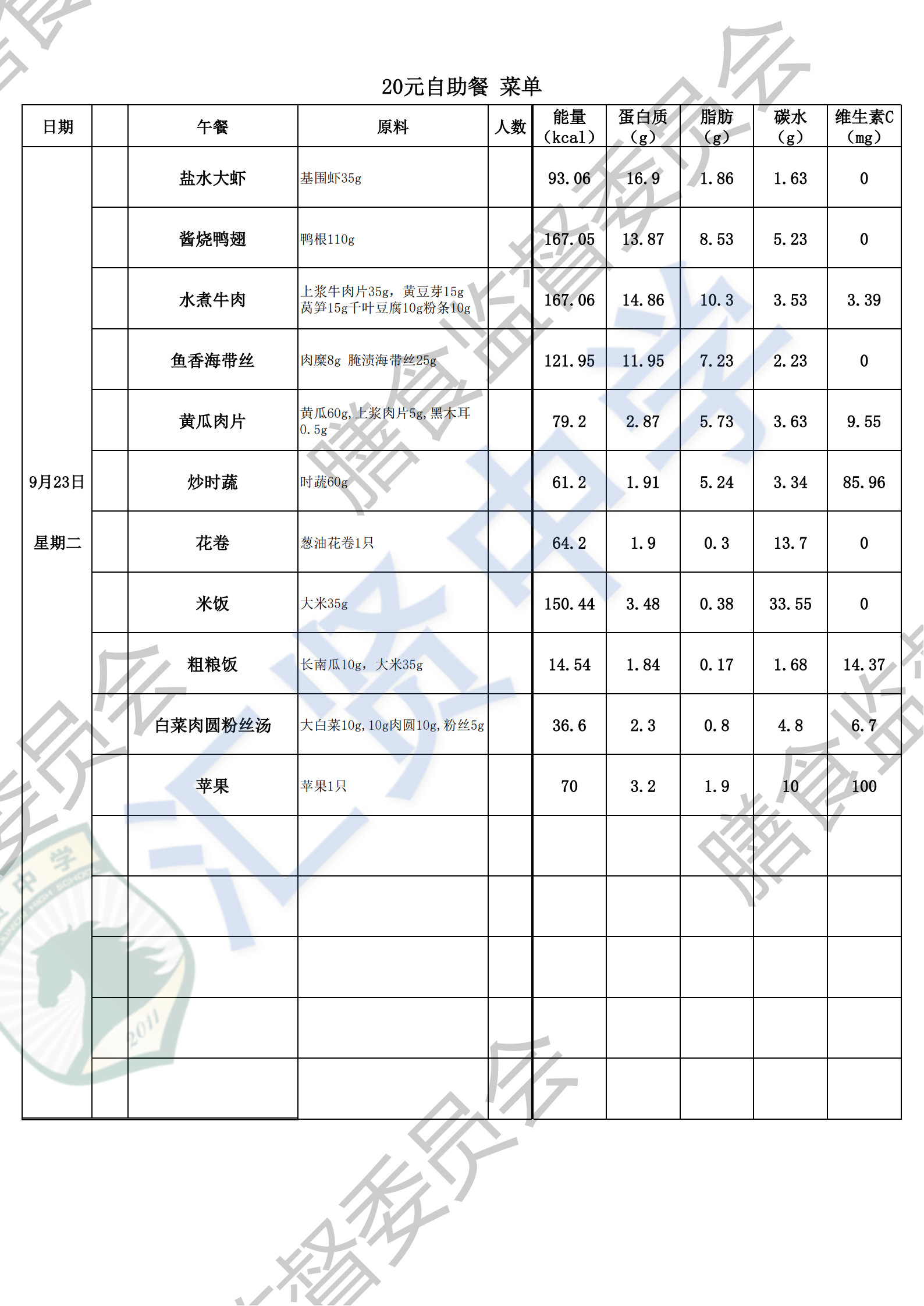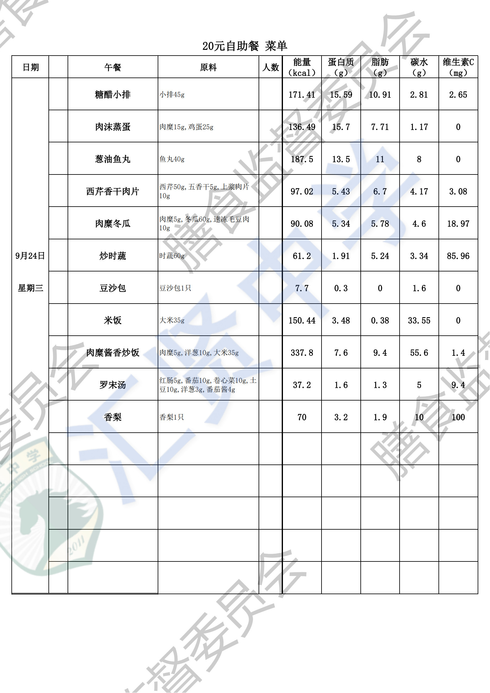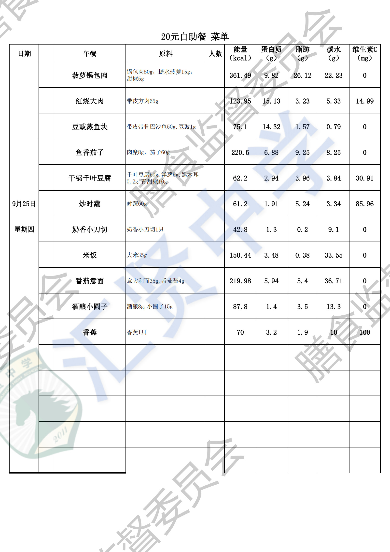 汇贤中学2025学年第一学期第4周师生菜单