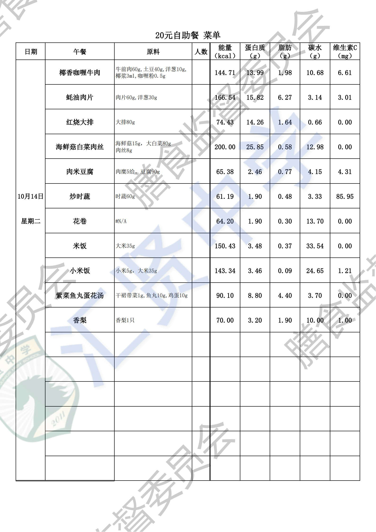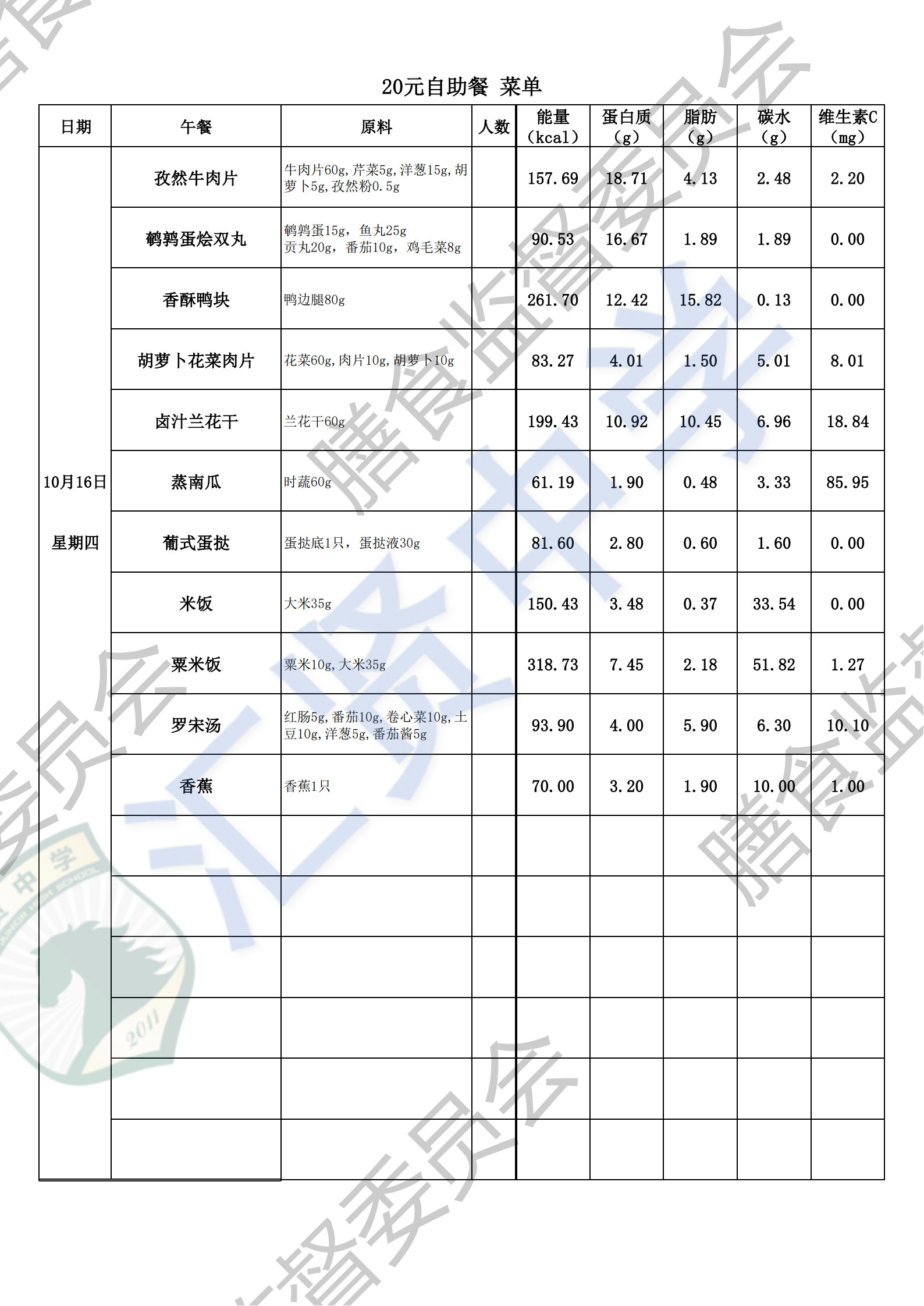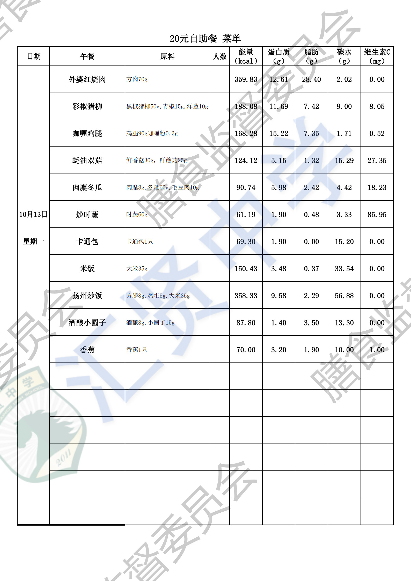 汇贤中学2025学年第一学期第4周师生菜单
